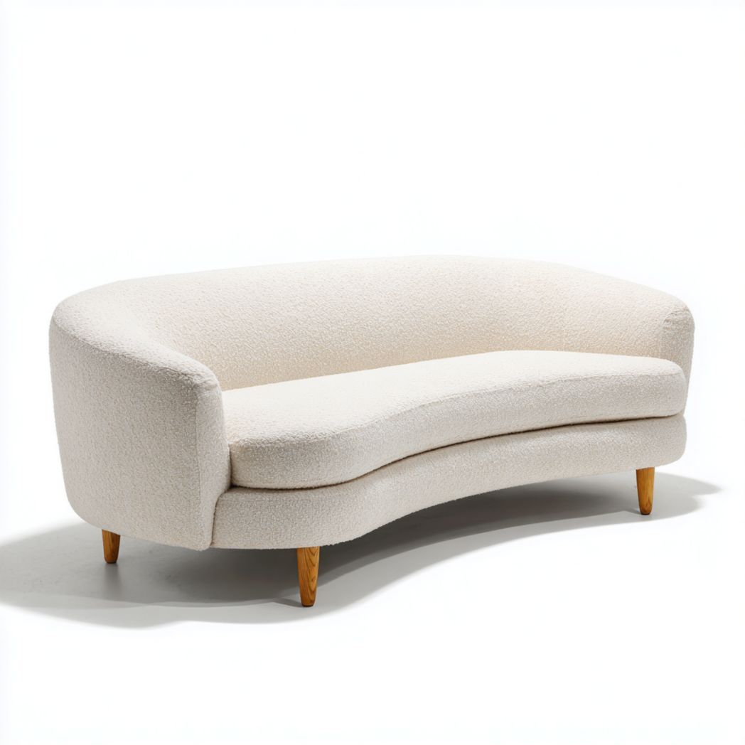 Materiał: Tkanina poliestrowa typu boucle, pianka poliuretanowa, lite drewno sosnowe